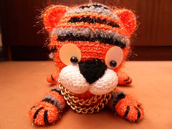Тигр связан столбиками без накида. Нужная форма достигается прибавлениями (в один столбик предыдущего ряда вяжется 2 столбика) и убавлениями (столбик пропускается).