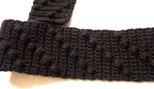 Вариант прямоугольного донышка: вяжем чёрной нитью цепочку из воздушных петель (ВП) длиной, немного меньшей длины передней стороны сумки. Чем меньше будет цепочка ВП, тем более квадратным получится в итоге донышко. Чем ближе длина цепочки ВП к длине сумки, тем более вытянутым (прямоугольным) будет в итоге дно. Далее вяжется полотно СБН. Не забывайте об 1 петле подъёма в начале каждого ряда. Прикладывайте связанное полотно к «трубе» сумки (т.е. к сшитой основе), чтобы определить, когда закончить вязание. Рекомендую при примерке пользоваться булавками-иголочками для фиксации.