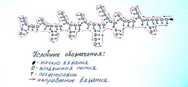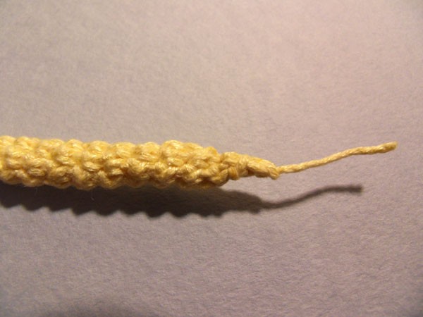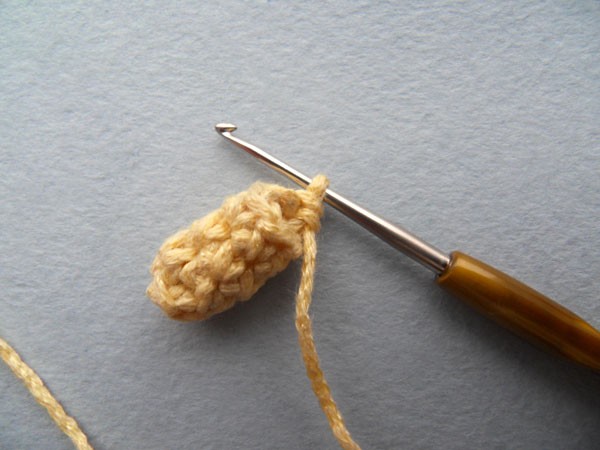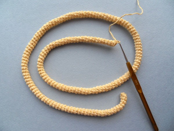 2. Далее начинаем вязать шнур. Вяжем цепочку из 6 воздушных петель, замыкаем её в кольцо. Далее по кругу вяжем столбики без накида.