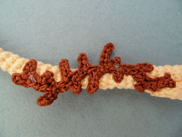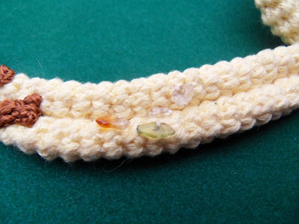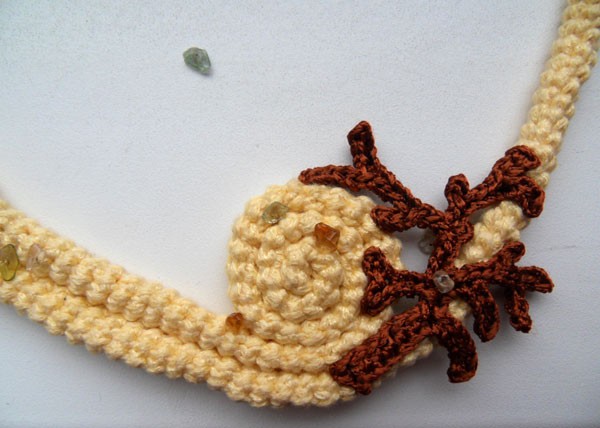 Материалы: жёлтый хлопок, коричневая шёлковая пряжа, маленькие прозрачные и полупрозрачные самоцветы (минералы) – остатки старых бус или бисер зелёных, коричневых, желтоватых оттенков. Крючок. Дополнительно (для облегчения работы): булавки.