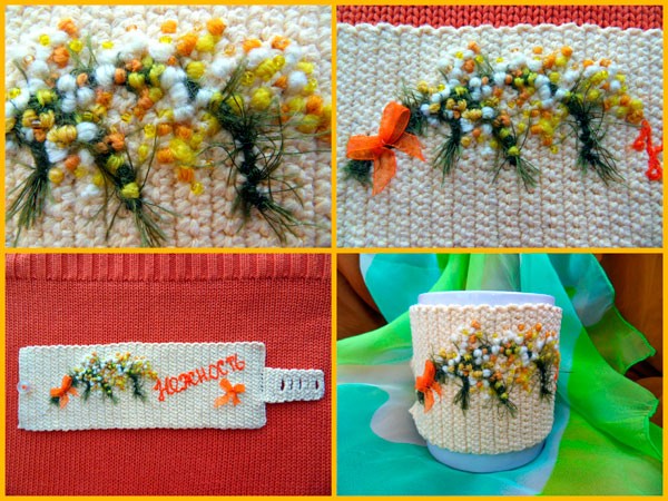 Вязанный крючком чехол для кружки Нежная Мимоза. Объёмная вышивка по трикотажу, декоративные элементы делают это весьма утилитарный аксессуар очень душевным, во всех смыслах тёплым и изысканным.