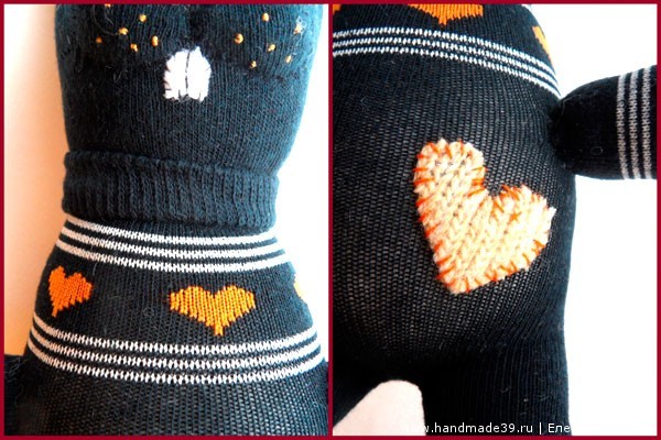 Материалы: пара носков (желательно новых))), наполнитель (синтепон, вата), кусок светлого толстого трикотажа (примерно 7х7 см) для носика и сердечка, кусок белой ткани для глаз (7х7 см), 2 больших чёрных бусины для глаз, ножницы, нитки, иголка, булавки.