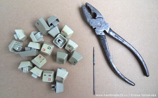 Материалы и подручные средства: синий хлопок (нить достаточно толстая), компьютерная клавиатура (точнее, кнопки от клавиатуры), подкладочная ткань, замок-«молния», фурнитура для ручек (по желанию), толстая «цыганская» игла или шило, газовая плита, кусачки, обычные швейные нитки и иголки.