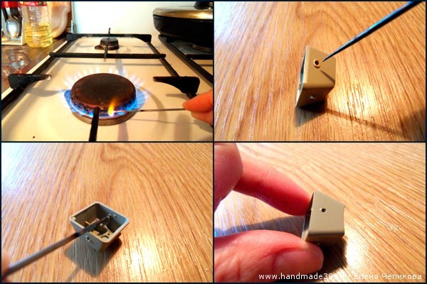 3. Делаем дырочки с четырёх сторон на каждой клавише. Для этого нагреваем «цыганскую» иглу или шило на огне газовой плиты (кончик иглы достаточно подержать над огнём около минуты).