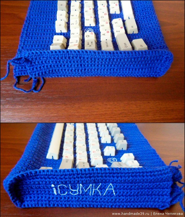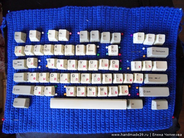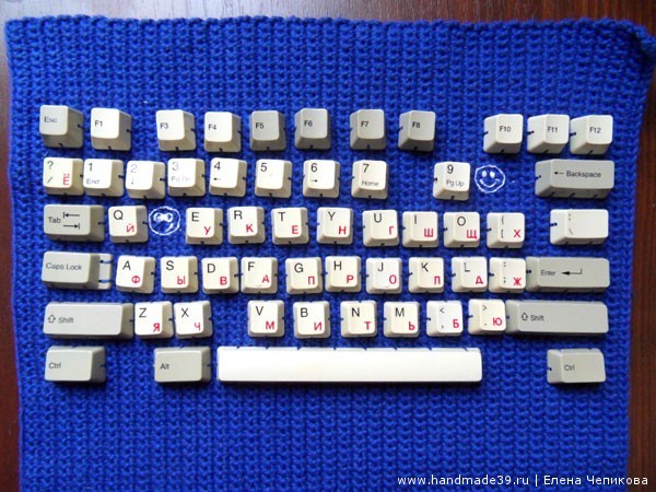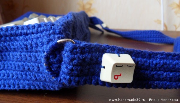 Идея сделать подобную сумку зрела у меня несколько лет. «Картинка» в голове сложилась практически сразу, но было много размышлений о том, как лучше прикрепить клавиши к основе сумки. Вариант приклеить я не рассматривала в принципе: хотелось, чтобы сумка была практичной, а клея, который надёжно будет держать пластик на вязаном полотне, я не знаю. В итоге решила крепко пришить каждую клавишу.