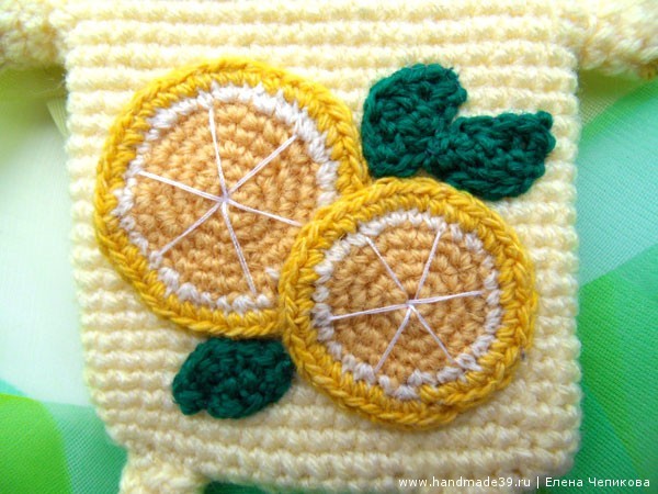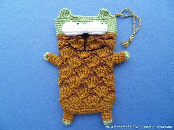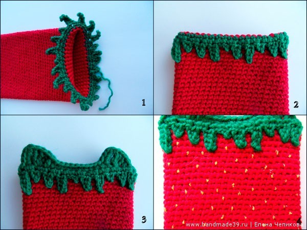 Результат виден на фото № 1. Сгибаем «листики», пришиваем их к основе чехла (фото № 2). Привязываем зелёные «ушки» (фото № 3).