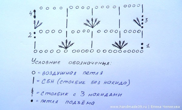 Нам надо эту схему вязать именно по кругу. Для этого в конце кругового ряда соединять узор и следить, чтобы «чешуйки» из столбиков с 3 накидами располагались строго в шахматном порядке. Это несложно, можно в конце ряда пропустить не 4 петли цепочки, а 3 или 5, например.
