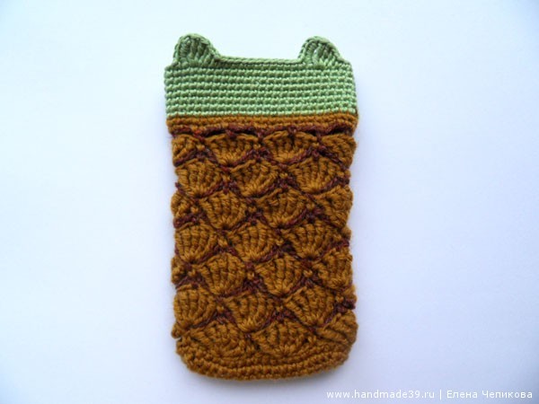 Все чехлы я вяжу по одному принципу ( в начале описания есть ссылка на соответствующий мастер-класс). Вяжется плоское донышко, а дальше столбики без накида (или узор по рисунку) по кругу. Когда достигается нужная длина чехла, вяжутся ушки. Всё. Отверстие сверху (где ушки). Швов в таких чехлах нет в принципе, они бесшовные (за что я их и люблю). Если не разберётесь, напишите — будем разбираться вместе.