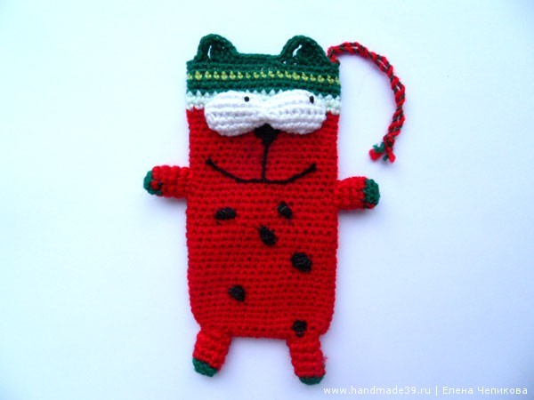 1. Вяжем основу (красный цвет). Принцип вязания (описание) основы чехла можно посмотреть здесь. Уши пока не вяжем!