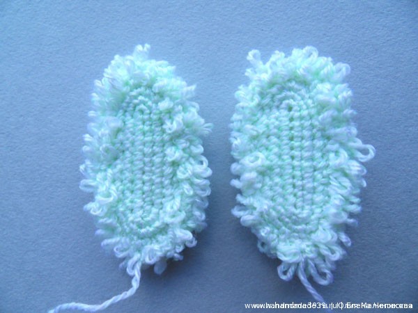 Внутренняя часть уха: набираем цепочку из 12 ВП. Вяжем 4 ряда по кругу. В крайних точках вяжем рядом по 2 прибавки. Всё вяжется вытянутыми петлями.