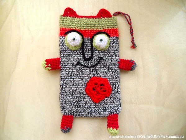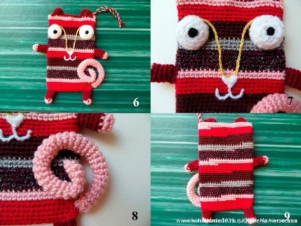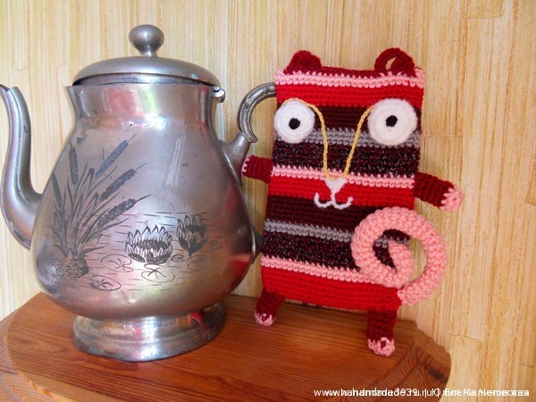 Вот ещё один вариант необычного кота. Особый шарм чехлу придаёт свёрнутый колечком хвост (смотри фото №8). Хвост вяжется по базовому описанию, но длиннее. После пришивается к основе.