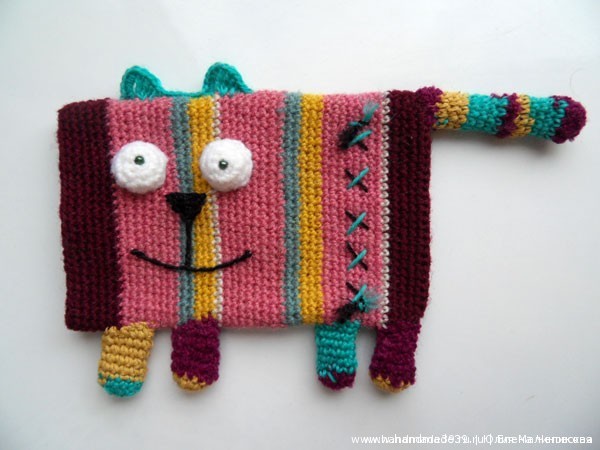 1. Вяжем основу. Принцип вязания (описание) основы чехла можно посмотреть здесь. Тело, ушки, лапы, хвост – всё вяжется по базовому описанию, только пришивается по-другому. Ушки вывязываем на боковой стороне. Передние лапы пришиваем под углом (смотри фото №2). Хвост пришиваем так, чтобы он задорно торчал вверх. Цветовая гамма, порядок чередования полос – по настроению. Не бойтесь экспериментов! В данном случае переборщить с цветом практически невозможно.