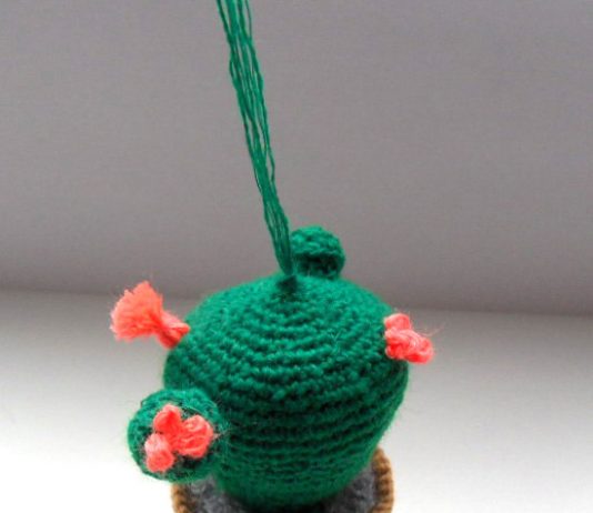 Такой вязаный горшочек можно повесить на ёлочку, внешне игрушка напоминает шарик.